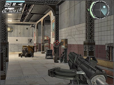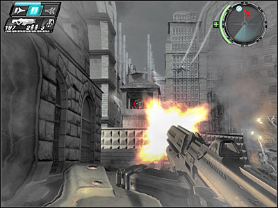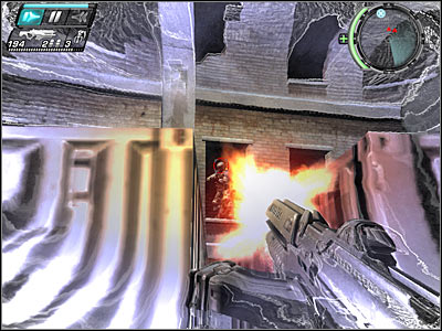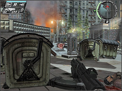 Start off by killing some of the closer enemy units. You should be using the container for cover. There's also an enemy sniper in this area (screen). It's very important that you take him out as soon as possible, because he's got a great view at the surroundings. It would be a good idea to stop the time here in order to increase your chances of hitting him.