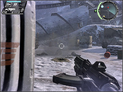 There are three enemy soldiers just around the corner. Killing them can be very easy. I'd strongly recommend using a grenade launcher against them (screen), however make sure that you have more grenades or a rocket launcher at your disposal. Turn around and move back to the gate. There's an enemy vehicle heading your way. Save the game!
