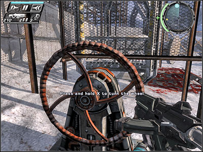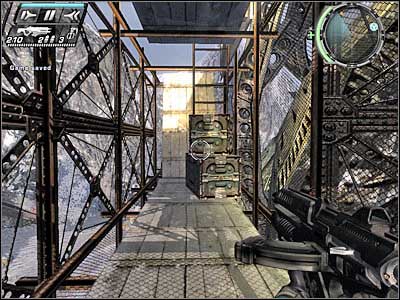 Now you will only have to use a reverse time feature. If you've done everything correctly, this elevator will go back to the upper floor on its own. Leave it as soon as possible, because the power bar is going to be depleted very soon. You'll find yourself on one of the lower levels of the scaffolding. Turn left and start moving forward. Save your game here.