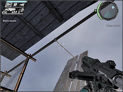 Once you've reached the opposite end of the platform, you will have to destroy a rope which holds a small bridge. Check my screen if you're having some difficulties finding this object. Performing this action will allow you to proceed to a new sniper tower. There's a rocket launcher here. It would be wise to pick it up. Use the ladder to get to the ground floor. Save your game.