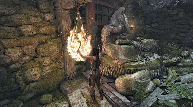 To speed up the process of collecting salvage, you can burn bags, such as the one you see above (ignite the torch at one of the lamps first). You'll find the first one in the second base camp, the other by altar west of the ruins, where Whitman is. Destroying one bag gives you 20 Salvage points.