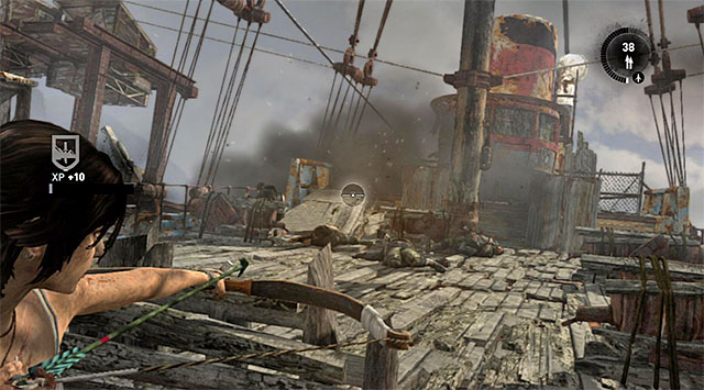 When you run out of ammo, look around for supplies or switch to a pistol or the bow. Don't waste your supplies on the enemies sliding down the zip-line; it's better to take them down hand-to-hand (climbing axe) or at close distance (shotgun). Keep fighting until a cut-scene is triggered.
