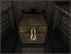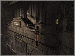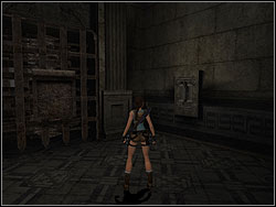 ![]() | Go to the stone plate, stand on it for the moment and run quickly. When the hammer is falling down, jump to it and then jump to the shelf. You must do it very fast. Take large first-aid kit and jump to the lower shelf. Take ammo, then use the bar to jump to the next shelf. |