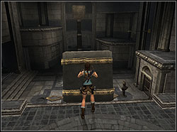 ![]() | Don't stand on the plate, because when you do it, the hammer will kill you. Close to the stone block and move it on the plate. The hammer will fall down and break the block. Inside is a statue - push it to the one of the slot in the chamber. Go to the second statue, which is on right side of the room and push it to the second slot. |