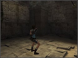![]() | Stand on the centre of the room, turn in the direction of square with the statue and band. Throw the line and grab the band. Twitch - the stone column will break do the same with the statue on the other side of the chamber. Jump to the stone block on the left and jump in the stone niche. |