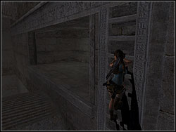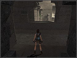 ![]() | You're in the corridor. Go forward as you come to the edge of the chamber. Move down the ground by grabbing the edge and jumping down. There is a fancy stone block - move it through the wall and go to the niche. Take shotgun ammo and small first-aid kit. |