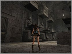 ![]() | In the Sphinx's back is lever - move it down - the gate under will open. Jump down to the courtyard and go through the open gate. Go forward . You will come to the room with statues in the line. Kill lions and switch the lever in the wall. The bars will move up and the statues will near and then back to the previous position. |