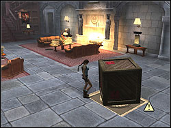 | In the main hall find a fancy plate in the floor. When you are standing on it, a safe - deposit behind the fireplace is opening, but unfortunately, when you are peeling, the safe - deposit is closing. Go near to the boxes, find a box with red label, push it on the plate. |