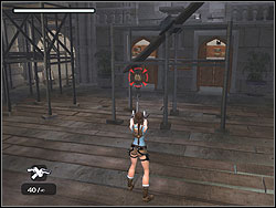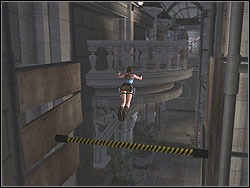 | After that between container and statue on the wall will appear button. Shoot at it - one of the barrier, which is blocking the underground passage will unlock. Go on the end of the mezzanine, take large medipack and shoot at the knot of the line, which is chaining the large statue. The statue will reel, but not fall down because the two another lines are chaining it. |