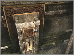 ![]() | Turn back to the gear and jump to the back to grab the edge above the gear. Stand above the lever and fall down. Grab the lever - one of the bars in the tomb of c Qualopec will move up. |