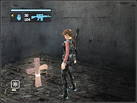 You will have some problems with the next cross. Look for an opening on the left wall. You will be able to climb up here (#1). Start moving towards the left edge of the screen. Stand by the small window and pick up a cross (#2).