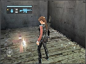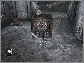 Once you've reached a large warehouse, use the grapple in order to get rid of a ventilation grate. Use the fork lift truck. You will have to build a tower that leads to a small entrance. Three crates is enough. Stand on top of the tower (#1) and make a jump towards the opening. There's a silver cross in this room (#2). Pick it up and get back to the fork lift.