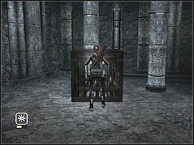 You will have to reach the main hall once again. There's an elevator here. Ignore it for now and turn left. You will have to find the last movable element (#1). If you have pressed it correctly (along with the previous ones), you'll unlock a small passage. Go there now and pick up the last cross of this mission (#2).