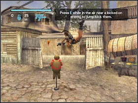A short cut-scene will appear on your screen shortly (#1). You will be informed that you have to meet Anaya at a nearby marketplace. Before you proceed to that location, it would be best to practice some of Lara's new moves. There's a small dummy on your right. You will be able to use it for much needed practice. Start off by throwing a few punches at it. One of the coolest moves is being activated in the air (#2). The most important thing is that the time slows down a little. Thanks to that, you will be able to make a few precise shots.