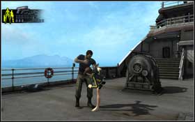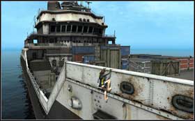 Use the containers to move yourself on the prow. After that jump on containers, which are located on the right side of the deck. Now go in the direction of the stern. Go to the end and jump on the deck. Kill one of the guards during your move.