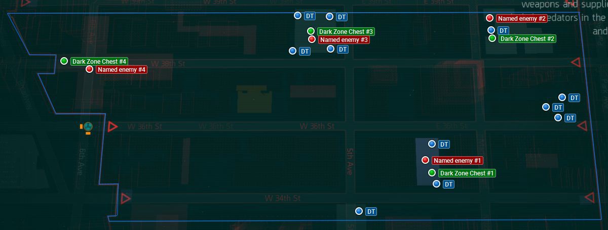 - 4 unique, named enemies - each one of them patrolling the area surrounding one of the Dark Zone chests.