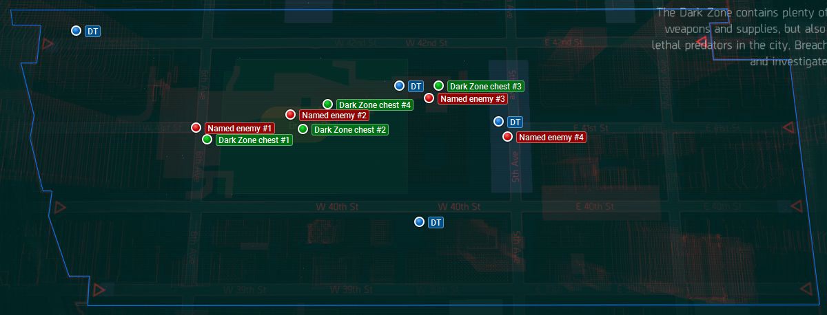 - 4 unique, named enemies - each one of them patrolling the area surrounding one of the Dark Zone chests. Two of them are underground, one is inside of a building, the last one is patrolling the extraction area.