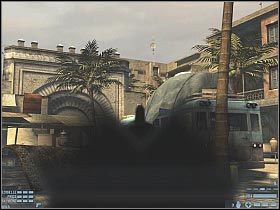 I'd personally recommend moving towards the left building... that is... if you've managed to clear out ALL of the surrounding balconies (#1). Start shooting at the terrorists hiding by the nearby bus. Once they're gone, start running towards the glowing icon (#2). Wait for the rest of the team to show up!