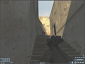 Now you will have to enter a nearby building (#1). I have to warn you, though. The room is going to be filled with enemy soldiers. You might want to consider storming the place. Alternatively, you could throw some grenades inside. Once you've cleared the first room, head on to the next one. A single soldier will be waiting for you here. Exit the building. Move up closer to the steel barrier. You should notice a few additional opponents (#2). Take them out. After that, use the nearby stairs.