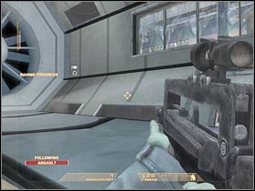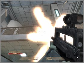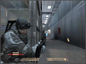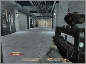 You will have to get closer to a left passageway. This corridor leads to a new room. Sadly, this whole area is being guarded by the terrorists. As a result, you will have to take care of this problem (#1). Make sure that you're hiding behind cover. Once you've taken out all enemy units, start moving towards your next destination (#2). The game will create a final checkpoint here. This is going to be the MOST DIFFICULT section of the level, so get ready!