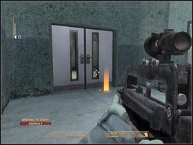 Gather the rest of the team around your position and start moving towards a new area of the map (#1). There aren't any enemy troops here, so proceed to the next room. The game will create an autosave here. Be careful. One of the terrorist will be hiding on your left (#2). Ignore a nearby door. Keep going straight. You will come across a new door. This passageway leads to a much bigger room.