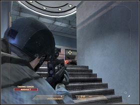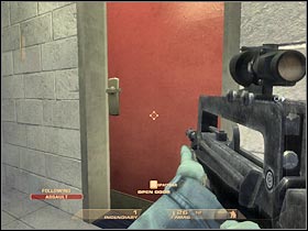 Take a look at your personal map. As you've probably noticed, there are two ways to get to this room, however I wouldn't recommend wasting time on simultaneous attacks. Order your team members to stand near a door, so they will be able to help you out during these fights. Open the door and start shooting at the terrorists (#2). You should be using the left wall for cover.