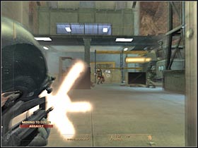 Try moving closer to the next room. You will have to be very careful here. At least one enemy soldiers will be hiding in this room (#1). He's behind the pillar. Once the area has been secured, order your men to proceed with the assault. You will have to help them from the right flank. You shouldn't have any problems securing this warehouse (#2).