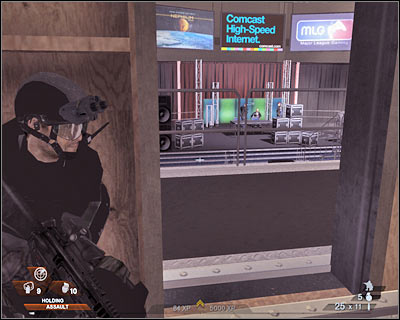 Make sure that you're crouching here, so you won't be seen by any of the terrorists. Head on towards the stairs and approach the left door. Take cover behind the wall next to the door. After that, open it slowly. You should have a nice view at the stage (screen).