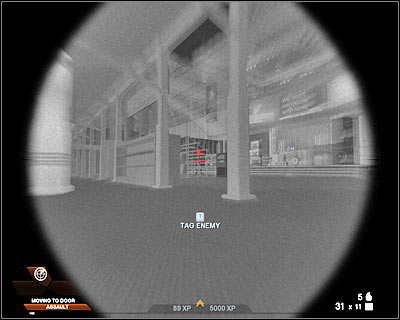 You should also consider throwing some of the carried grenades at enemy soldiers. The grenades should land near larger groups of enemy units. You should be focused on securing the upper balcony (screen). Use the thermal goggles if you're having problems locating enemy troops. Once the battle is over, you'll be given new orders. Order your squad members to follow you.