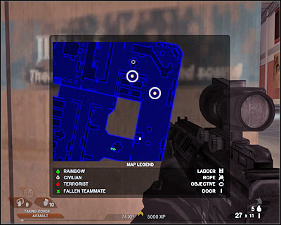 The game will suggest that you turn on the thermal scan. I'd also recommend using it. You will have to eliminate two remaining enemy units. Look at my screen if you can't find them on your own. Start off by neutralizing the right target, but be careful, because this terrorist is on the move. Once he's gone, move closer and surprise his colleague. Head on to your goal area and wait for the game to grant you with a new task.