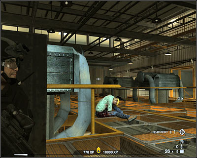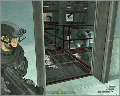The second group is currently occupying the lower level of the facility. You can get rid of them using one of several approach methods. I would recommend staying here. If you decide to remain on the first floor, open one of the doors (screen) and start shooting at the terrorists from a distance. Obviously you should be using nearby walls for cover.