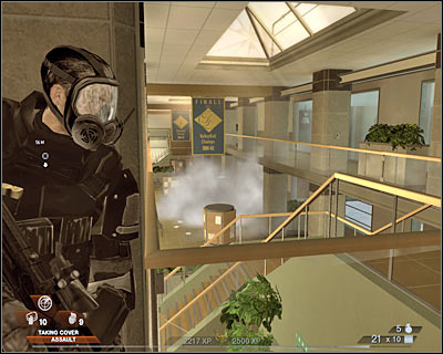 Now you will have to start shooting at the remaining enemy soldiers. At least of them are currently on this floor. The rest is patrolling the lower level. Thankfully, you should be able to find a good cover (screen) and you can also count on the support from the rest of the team. Once you've secured this floor, get closer to the stairs and check the lower level from here. Kill a few additional thugs.