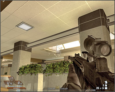 I would recommend staying on the first floor, because that'll make your life a lot easier. Start moving forward and eventually you will come across a new large corridor. One of the enemy snipers is standing on the roof of the building. Take him out from here (screen), before he does any real damage.