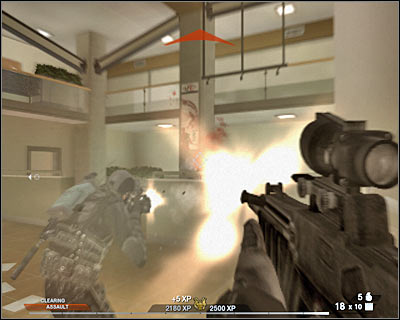Once you're ready, order your squad members to proceed with the assault. I'd strongly recommend allowing them to use an explosive charge or to throw a grenade inside, mostly because there aren't any civilians in the area. Either way, you shouldn't have any major problems securing this first large room (screen). Watch out only for the guy who's occupying one of the upper balconies.