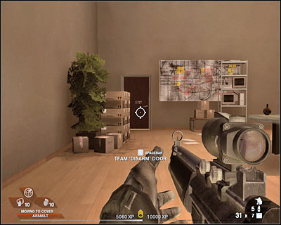 Your colleagues should be able to secure this area without your help. Start moving forward and enter the room to your left. Order one of your colleagues to disarm a bomb which has been placed on a nearby door (screen). Your other ally should automatically approach a computer. Reload your assault rifle and get ready for a very challenging battle!