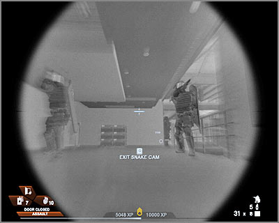 Watch out for the windows. One of the terrorists may appear there and it'll be up to you to get rid of him quickly. Rejoin with the rest of your squad and head on towards a new door. Use the snake camera on the door and you'll notice two other enemy units (screen). Plant an explosive charge on the door and give the order to proceed with an assault.