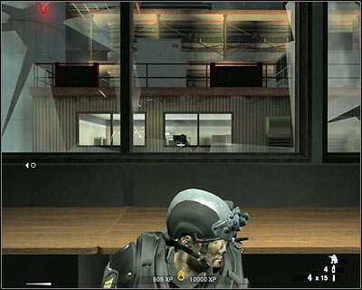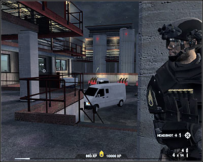 You will also have to secure one of the upper balconies, because a terrorist is hiding there and he would be able to injure your character. Leave the server room and hide somewhere to your right (screen). I would recommend that you focus your attention on securing the area around white vans. It would be a good idea to use grenades during these fights.