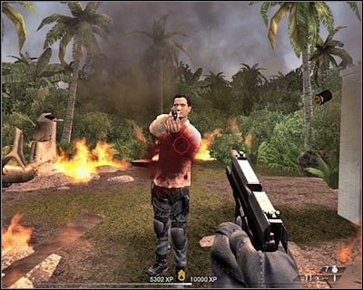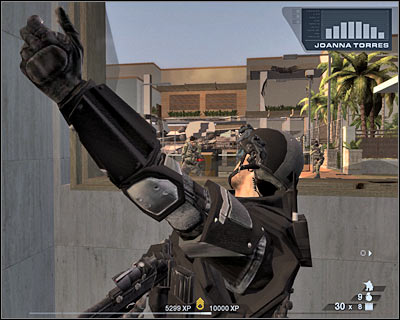 As you've probably noticed, one of the missiles has destroyed the fence and created a small hole (screen). This will allow you to enter the tennis court. Start running towards the terrorists and use your weapon against them at the same time. You can't stay in the open for too long, because the gunship will be back any second now.