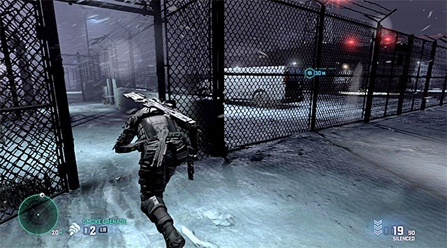Continue your crossing towards the big building, keep to the fence on the left as close as possible and make use of the covers that you pass by. Soon, you should be able to notice an open gate. Wait for one of the snipers, who is standing on the roof of the meteorological station, to stop checking out this area and take the narrow passage between the fences. Also here, you need to make an extensive use of covers because the square is being patrolled by another enemy and he may also stop very close to the right fence.