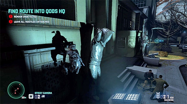 The beginning of this mission is untypical in that you need to follow general Rohani, avoid detection and without attacking any of the guards you encounter. Do not go along the main route and choose the lawn located to the left. Go ahead and stop after you reach the first guard and the security camera. Note that the game informs you of the camera monitoring so, this will allow you to avoid being detected effectively. At the same time, it is worth knowing that the cameras that you find further in the game can be destroyed or, temporarily disabled with the EMP charges. Still, this isn't necessary for the time being.
