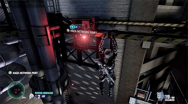Resume shimmying over the horizontal ledges and reach the corner, where it is possible to jump towards the interactive elements below. Don't forget about avoiding the lasers in the meantime. Go now towards the area marked by the game inside the vertical shaft, which has been shown in the screenshot. You need to press the interaction key/button here, thanks to which Fisher will hack into the net port.