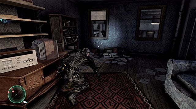 Stop after you reach the first window. Climb up here and walk into the bathroom. Carefully, approach the main area - apart from the guard that you have just walked past, there are also two others to the right. Take advantage of the fact that they are talking, while turned towards the TV. Quickly, squeeze past them and make it to the exit shown in the screenshot. Since you have come near the alleged Andriy Kobin's holding place, you will soon receive new objectives.