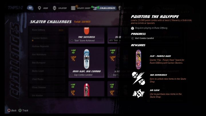 Each character available in the game has its own challenges. They are usually about performing a given sequence of tricks. These challenges unlock mainly cosmetic items or outfits.