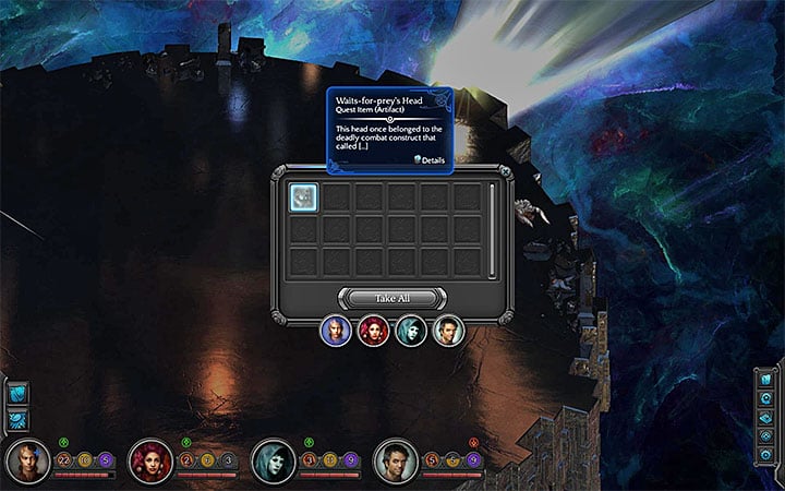 Waits-for-prey has 200 health points. This means you must use the best weapons, skills and spells to take care of him in acceptable time. At the same time you must watch out for opponent's attacks. Try placing your party members across the whole arena because Waits-for-prey uses rocket attacks that have area of effect. In addition to that, the machine is able to, among other things, teleport across the arena. Keep weaker party members as close from him as possible and use ranged attacks to deal damage. Be ready to quickly heal if needed or increase the resistance of characters for the battle by using specific skills, artifacts or cyphers.