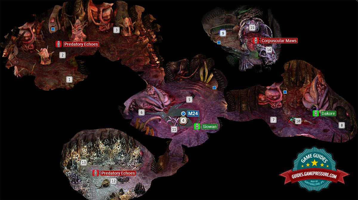 Note - After getting to the Gullet, you will no longer be able to get back to the interior, so prepare well for the plunge. Entering the next big location of the Bloom - Nethermost Cavity - is the same story (map M24). When you get there, it will not be possible to get back to the Gullet. During your first visit you should collect all useful items.