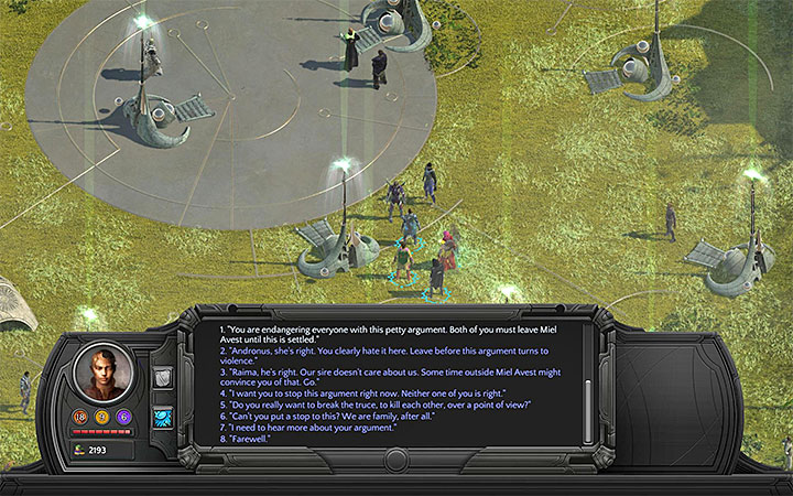 Return to Aadiriis and listen to a new dialogue. Your next task will be to solve the quarrel between Andronus Sandhand and Raima Cyro. You'll find both of them nearby; begin by finding the reason of the quarrel and listening to their standpoints. The conflict can be resolved in one of the following ways: