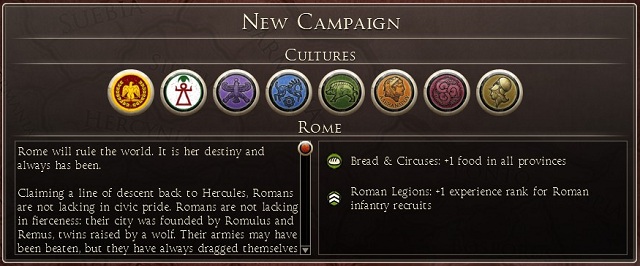 Once you decide which culture you want to represent, you have to choose a particular faction. This choice influences not only our starting position on the world map, but also additional advantages or disadvantages which characterize our empire. In the case of Rome or Carthage, regardless of the chosen family, you always start the game having the same provinces. The house or the dynasty you chose will affect the further gameplay, while the other two political factions will be active only in the Senate.