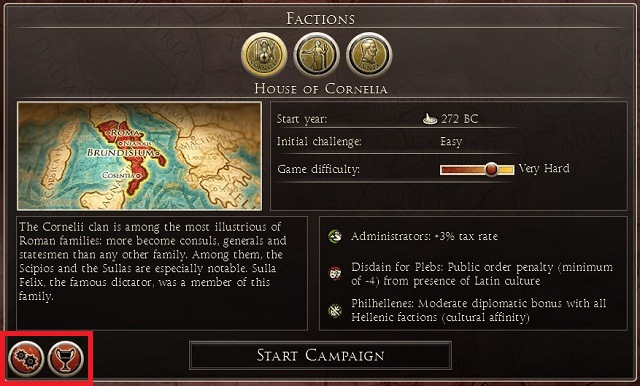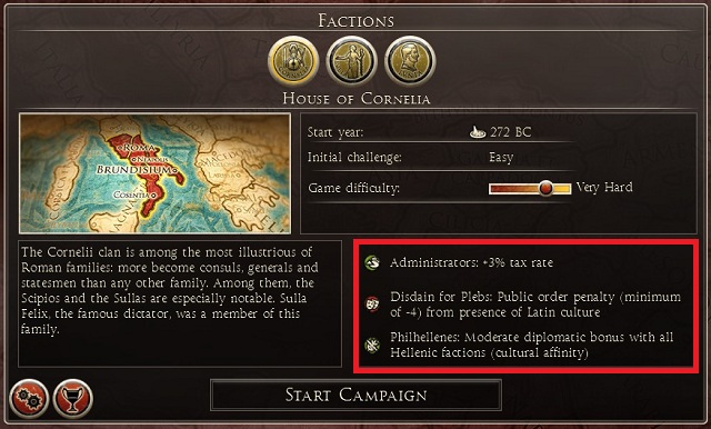 For the beginners I recommend playing the first large game part while controlling the Rome. I recommend here choosing house of Julia or Junia, because their negative traits are not as annoying as Disdain for Plebs in house of Cornelia.