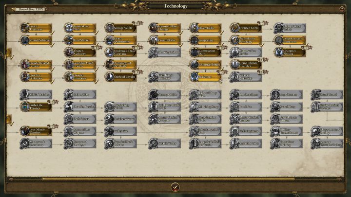 There are two things that make their economy stand out in comparison to other factions. First things first - research. Dwarves have access to dozens of different technologies that they can research during the campaign. Their early game is a little worse because of that, but after completing a portion of them and recruiting army they become unstoppable. Their insane income definitely help with unit recruitment - no other faction will be able to beat them when it comes to gold. 30,000 or even 40,000 gold each turn is a normal sight here.