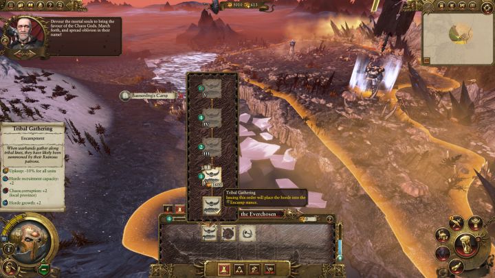 When the cut-scenes end, select your Lord and click on the Building Panel icon on the window that just opened. Upgrade the Nomadic Camp to Tribal Gathering. This will increase your recruitment capability, boost Horde Growth, as well as decrease the upkeep of your troops. As you now have to stand in a place until the building is completed, click on the Army Panel tab and recruit a single new unit (you can't recruit more at the moment as you will need gold for a research) - Chaos Marauders. Before you end the turn open the research window (by pressing 8) and start The Path to Ruination.